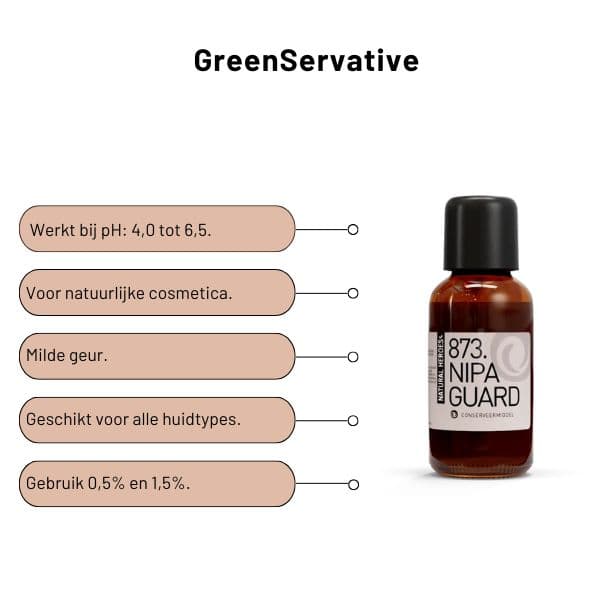 GreenServative bestaat uit Benzoëzuur, Sorbinezuur en Propanediol. Het is een natuurlijk conserveermiddel dat effectief werkt tegen bacteriën, gisten en schimmels. Je hoeft het daarom niet te combineren met andere conserveermiddelen. Het is geschikt voor zowel leave-on als rinse-off producten, zoals crèmes, serums, gels, shampoo en conditioner. Het is daarnaast geschikt voor ieder huidtype.