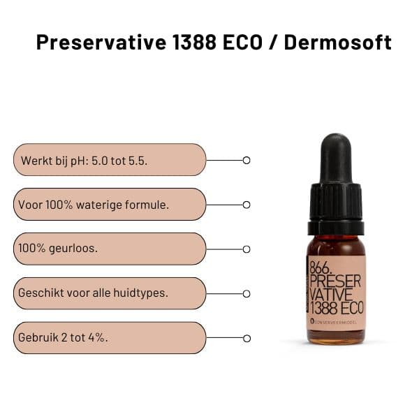 Preservative 1388 Eco bestaat uit Glycerine, Water, Natriumlevulinaat en Natriumanisaat. Dit conserveermiddel werkt goed tegen schimmels en bacteriën, maar beperkt tegen schimmels. Als je volledige bescherming zoekt, is het aan te raden om het te combineren met een aanvullend conserveermiddel zoals Preservative Eco. Dit conserveermiddel is heel geschikt voor het conserveren van toners of sprays (100% waterige producten), maar werkt niet in crèmes.
