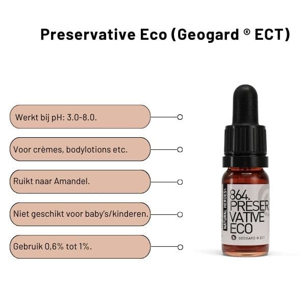 Preservative Eco bestaat uit Benzyl alcohol, Salicylzuur, Gycerine en Sorbinezuur. Dit conserveermiddel biedt een breed spectrum bescherming tegen bacteriën, gisten en schimmels. Je hoeft het daarom niet te combineren met andere conserveermiddelen. Dit maakt het een fijn ingrediënt in veel formules. Let wel op: door het gehalte aan salicylzuur is dit conserveermiddel niet geschikt voor producten die bedoeld zijn voor baby's en kinderen. Preservative Eco heeft een lichte geur (amandelachtig door benzylalcohol), maar deze verdwijnt meestal in de eindformule, zeker bij gebruik van Etherische oliën.