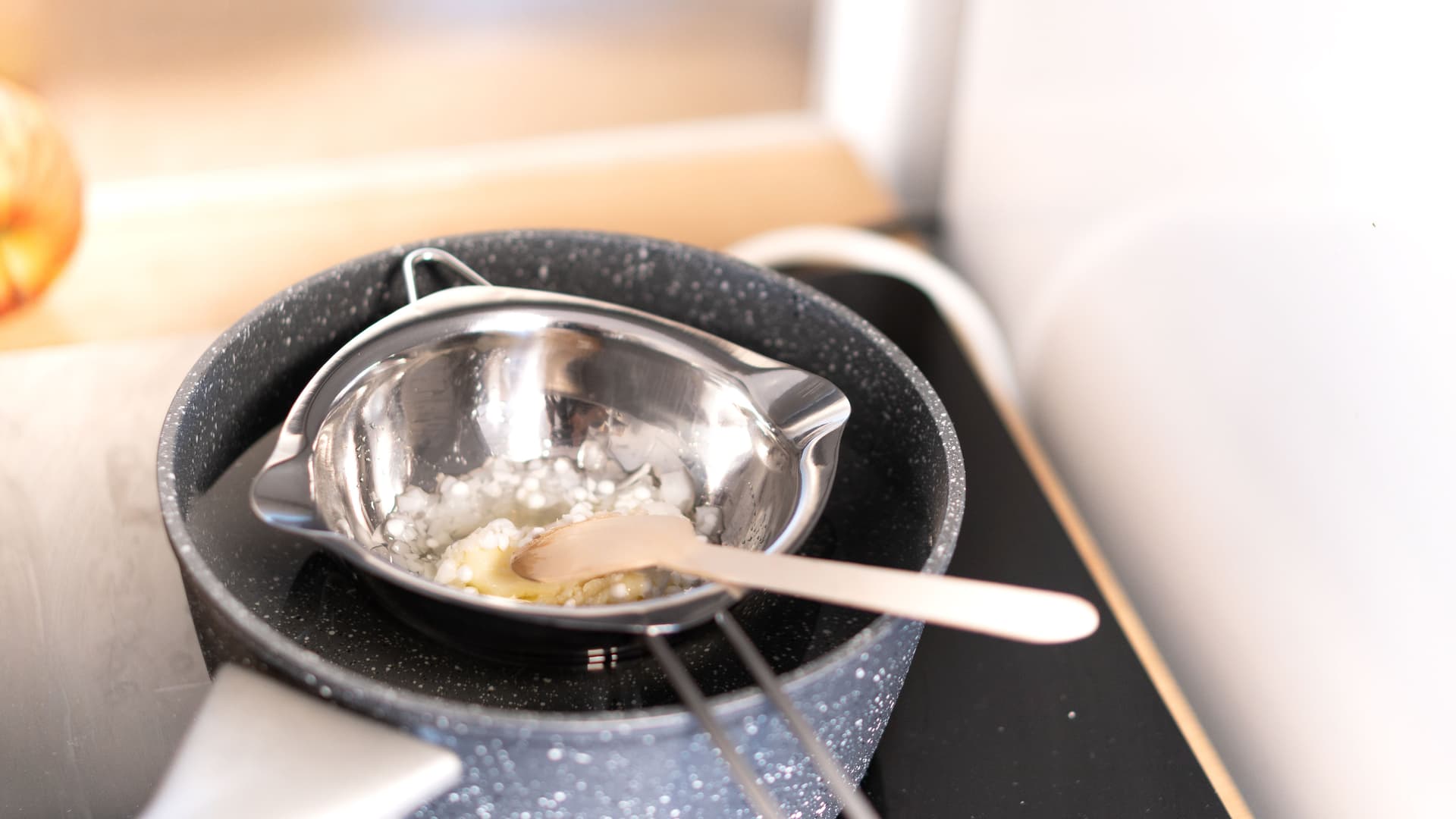Tegelijkertijd doe je hetzelfde in een ander pannetje de Cupuaçu Butter, Zoete Amandelolie en Olivem 1000. Dit smelt je ook au-bain marie en roer je tot een glad geheel.